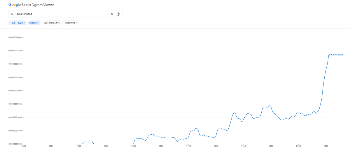 The use of “data for good” has a rich history, tracing its roots to 17th century studies on London’s birth and death rates that pioneered public health statistics and informed public policy. But the modern term evolved with the growth of data science, open data initiatives, and social responsibility, notably spurred by Tim Berners-Lee’s call for “raw data, now” to fuel social policy. The term’s use grew exponentially, as illustrated by the growth of references in publications (see graph below).